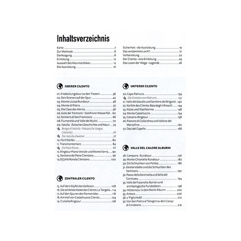 Diese Auswahl an 52 Touren im Nationalpark Cilento, Vallo di Diano und Alburni führen in traumhafte Landschaften, unberührte Natur mit atemberaubenden Aussichten. Eben all das, was nur ganz im Süden von Italien zu finden ist. Die Beschreibungen sind ausführlich mit Kartenausschnitten, Piktogrammen, Texten und Kurzüberblick sehr informativ gehalten. Diese Region ist ideal für versierte Biker, die auf der Suche nach Spaß sind, aber Fahrradtouristen und Familien kommen hier voll auf ihre Kosten. Ein perfektes Buch für alle, die einen MTB-Urlaub im Süden Salernos planen oder hier ihren Sommerurlaub verbringen und dabei nicht auf den geliebten Untersatz verzichten möchten.