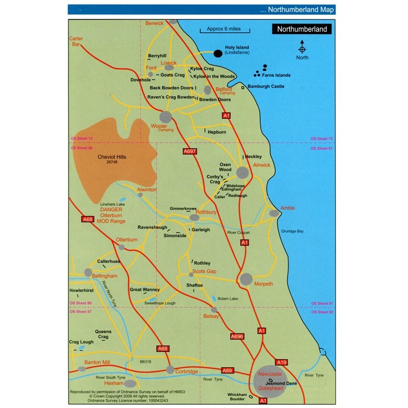 Gebiete: Back Bowden Doors, Berryhill, Bowden Doors, Caller Crag, Callerhues Crag, Corby´s Crag, Dovehole, Edlingham, Garleigh, Gimmerknown, Goats Crag, Heckley, Hepburn, Howlerhirst Crag, Jesmond Dene, Kyloe Crag, Kyloe in the Eoods, Oxen Wood, Queens Crag, Raven´s Crag Bowden, Redheugh, Rothley Crag, Shaftoe, Simonside Hills, Widehope, Minor Crag