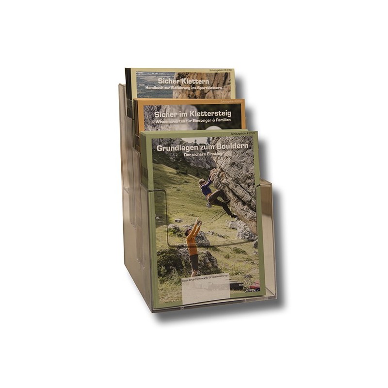 Outdoorkompetenz schärfen mit den Outdoorbroschüren. Im Set mit Ständer. 20 x Sicher im Klettersteig 20 x Sicher Klettern 20 x Grundlagen zum Bouldern 1 x Acrylständer mit 3 Fächern