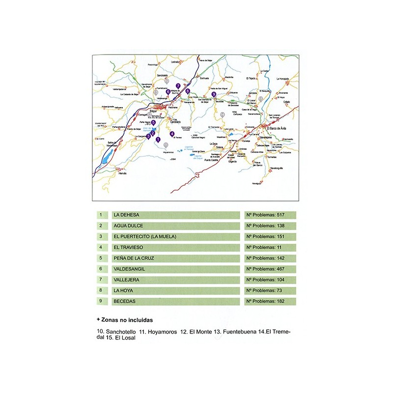 Folgende Gebiete sind im Führer enthalten: La Dehesa Agua Dulce El Puertecito (La Muela) El Travieso Peña de la Cruz Valdesangil Vallejera La Hoya Becedas