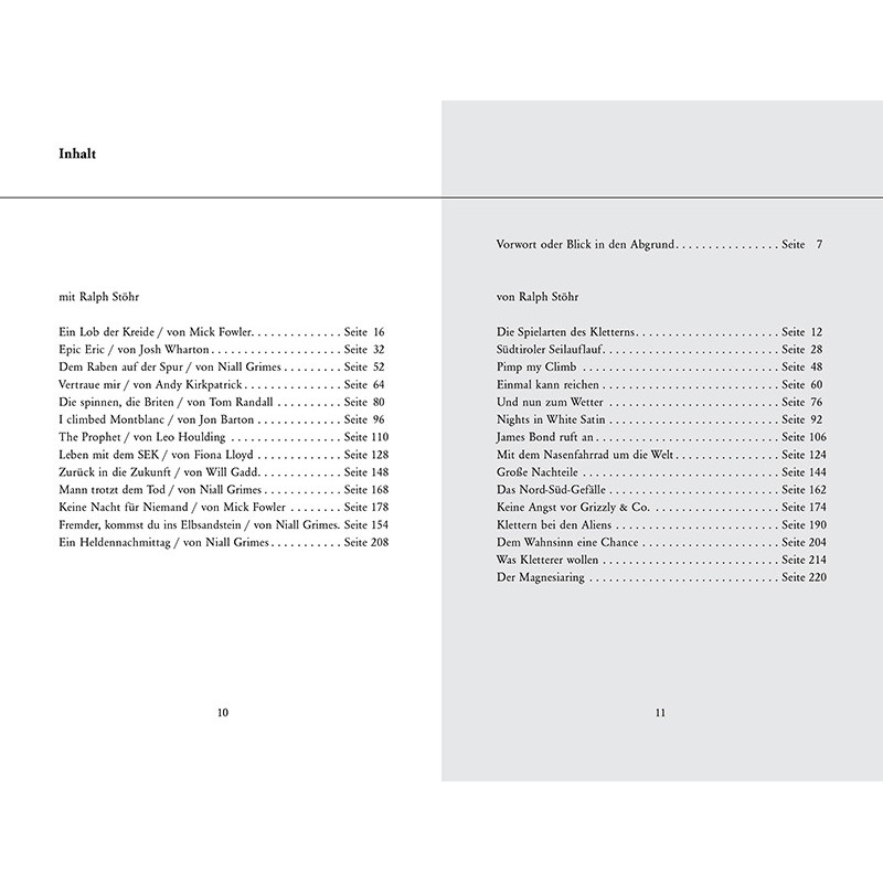 Die Kletterwelt wird seit eh und je von komischen Vögeln bevölkert, die für das Erlebnis in der Wand Ungemach auf sich nehmen, bei dem sich normale Menschen dezent an die Schläfe tippen. Dieses Buch enthält eine Auswahl der besten und schrägsten Geschichten, die in den letzten 20 Jahren in der Zeitschrift klettern erschienen sind – gesammelt oder geschrieben von Ralph Stöhr.