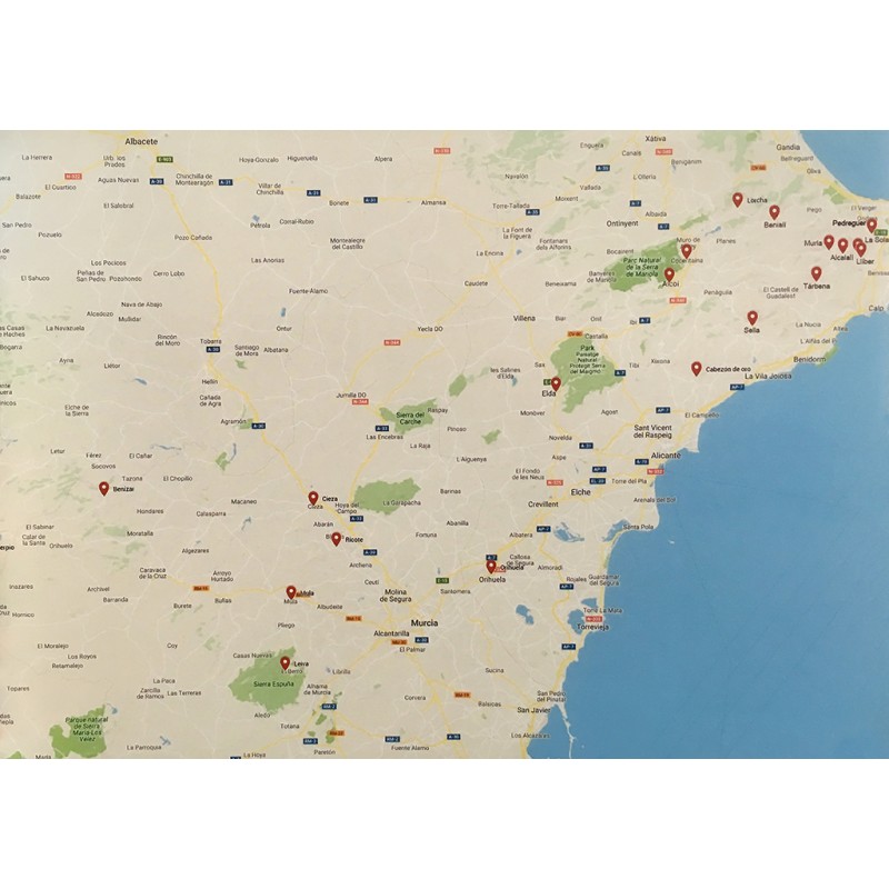 Pedreguer, Alcalalí, Murla, Jalón, Lliber, Benialí, Lorcha, Cocentaina, Terbena, Sella, Cabezón de Oro, Elda, Orihuela, Mula, Ricote, Cieza, Benizar, Nerpio, Leiva