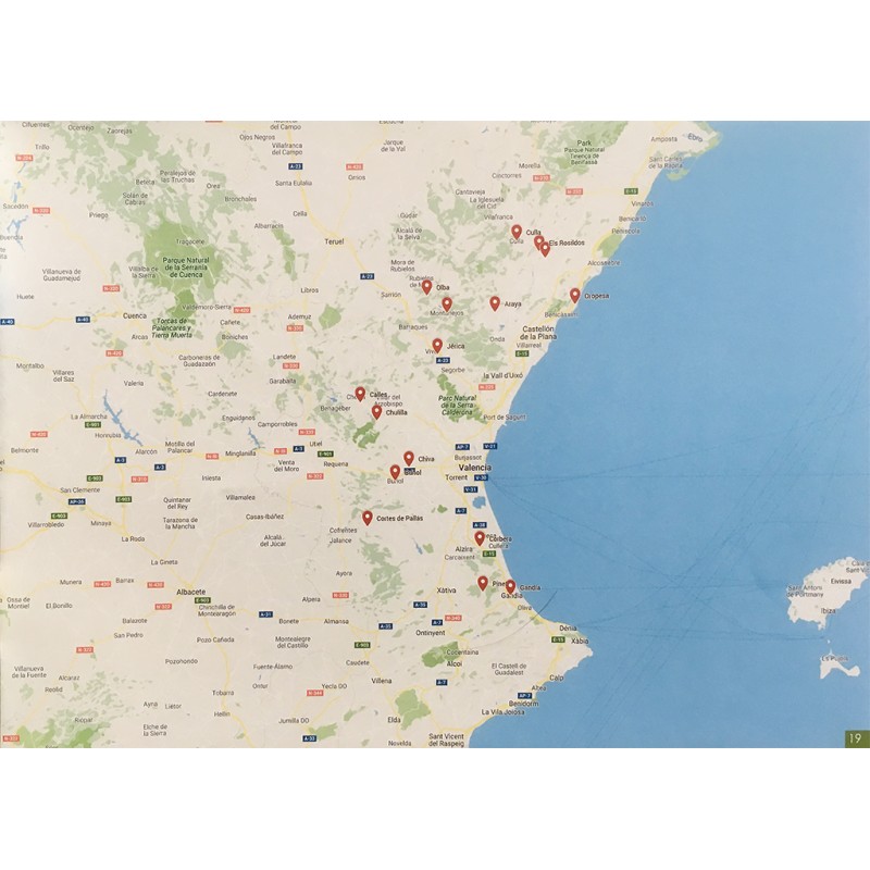 Oropesa, Serra Engarceran, Els Rosildos, Culla, Araia, Olba, Mantanejos, Jérica, Calles, Chulilla, Chiva, Bunol, Cortes de Pallás, Corbera, Gandía, Pinet