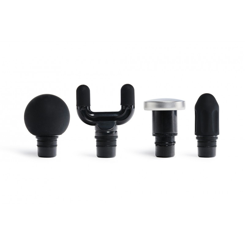 Die drei Silikonaufsätze sind für punktuelle oder flächige Massagen, der vierte Metallaufsatz ist in Verbingung mit Massageöl sehr gut für Ausstreichungen und zum Einmassieren von Salben geeignet.