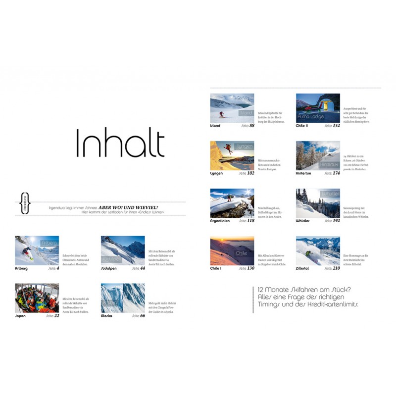 Rechtzeitig zur bevorstehenden Skisaison erscheint die zweite, komplett überarbeitete Auflage des Bildbandes Endless Winter. Auf 246 Seiten kann man dem Autor und Fotografen Michael Neumann auf seiner nie endenden Suche nach dem perfekten Schne einmal um den Globus folgen. In 12 Kapiteln zeigt er auf, wie und wo man ein Jahr lang Skifahren kann. Vom Arlberg führt die Reise via Alaska und die Lyngen Alps bis nach Chile und Argentinien – und zurück ins Zillertal. Jedes Kapitel wird ergänzt durch einen einseitigen Infokasten, der die Vorteile der jeweiligen Skidestination weiter herausarbeitet.