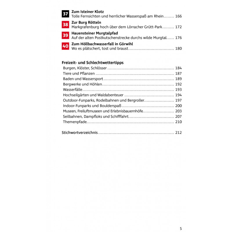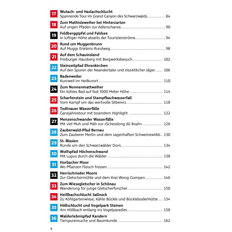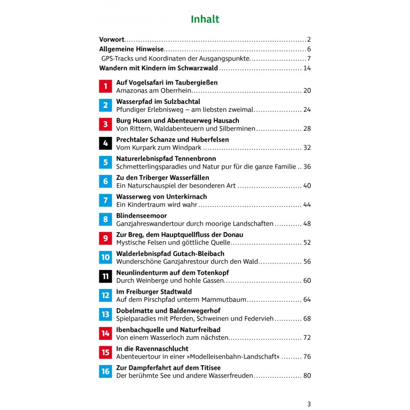 Die beliebte Urlaubsregion rund um Freiburg im Breisgau bietet Familien mit Kindern Wanderungen aller Schwierigkeitsgrade, von spannenden Erlebniswegen für die Allerkleinsten über leichte Höhenwanderungen bis hin zu alpin anmutenden Touren für Gipfelstürmer. Bekannte Wanderziele wie der Feldberg, der Titisee, die Triberger Wasserfälle oder die wilde Ravennaschlucht werden genauso vorgestellt wie die weniger geläufigen Routen durch die Moore des Hotzenwalds oder die liebevoll angelegten Wasserpfade im Sulzbachtal und bei Unterkirnach. Dazu machen über 60 Freizeit- und Schlechtwettertipps Lust auf die Erkundung der Umgebung abseits der Wanderrouten.