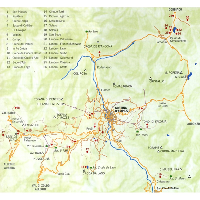 Folgende Gebiete sind im Führer enthalten: Són Pouses, Rio Gère, Crèpo Longo (Faloria), Sasso di Colfiére, La Lavagna, Volpèra (Sasso dei Finanzieri), Campo, Crèpe di Pantèi, In Pò Crepa, Crepe de Oucèra Basse, Crèpe de Oucèra Alte, Bèco d’Ajàl, Croda da Lago, Cinque Torri, Duca, Piccolo Lagazuòi, Sas de Stria, Setsas (Livinallongo), Salares, San Bodo (San Vito), Landro