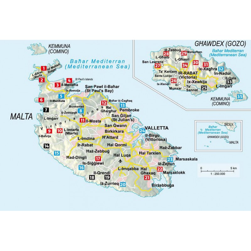 Felsige Küsten, karstige Landschaften, üppig blühende Täler und ein tiefblaues Mittelmeer – Malta, Gozo und Comino sind ein Inselarchipel voller Kontraste. Quirlig bunte Fischerdörfer und ruhige erholsame weitläufige Landschaften. Abwechslungsreiche Wanderungen in atemberaubender Natur und zu einmaligen historischen Stätten lassen sich hier unternehmen. Vorgestellt werden die 35 schönsten Touren. Die Touren entlang der imposanten Klippen bieten atemberaubende Ausblicke – und herrliche Bademöglichkeiten an entlegenen Stränden. Im Inselinneren lassen sich einsame Naturschönheiten entdecken, die sonst kaum ein Tourist erreicht. Ein besonderer Höhepunkt ist die mehrtägige Umrundung der ländlich geprägten Insel Gozo entlang der faszinierenden Küstenlinie.