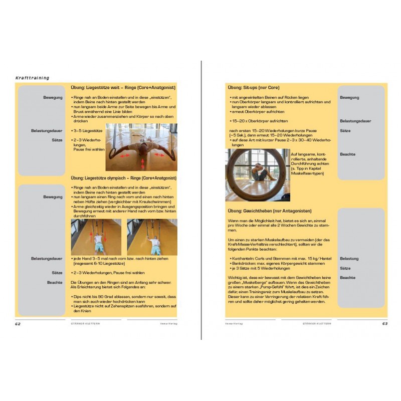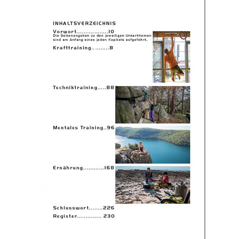 In den Kapiteln „Krafttraining“ und „Techniktraining“ findest du Grund- und Fachwissen sowie jede Menge praktischer Tipps, um dein Leistungsplateau zu überwinden. Das Kapitel „Mentales Training“ ist ein Augenöffner, um dein eigenes Verhalten, deine Einstellungen und Herangehensweisen an den Klettersport zu reflektieren. Im Kapitel „Ernährung“ wird die Lanze für gesundes Essen gebrochen und es heißt: „Man ist, was man NICHT isst“.