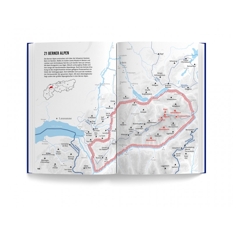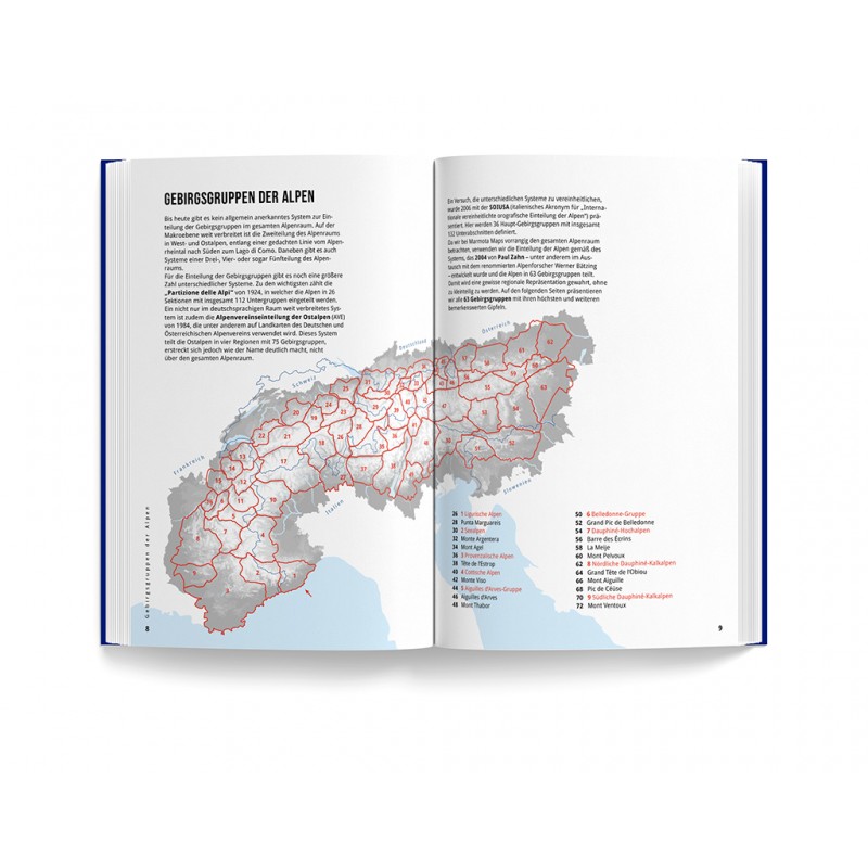 Jede der Gebirgsgruppen wird auf Doppelseite kurz vorgestellt. Von den Allgäuer bis zu den Ybbstaler Alpen. Von den Alpenausläufern bis zu den höchsten Spitzen der Walliser Alpen und des Mont Blanc-Massivs.