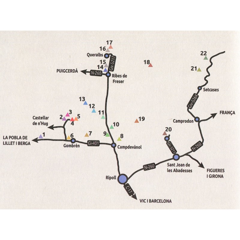 Coll de Merolla, Agulles del pla de la Pera, Coll Roig, Montgrony, Pardinella, Gombrèn, Clot de l'Espasa, Roca Roja de Corones, Pont de la Cabreta, El Sagnari, Les Coves, Cal Barricó, El Baell, La Lleixa, Vilamanya, Cingle de la Palanca, Dent d'en Rosell, Coma de Vaca, Mirador de la Tuta, Ogassa, Coma de L´Orri und Ulldeter