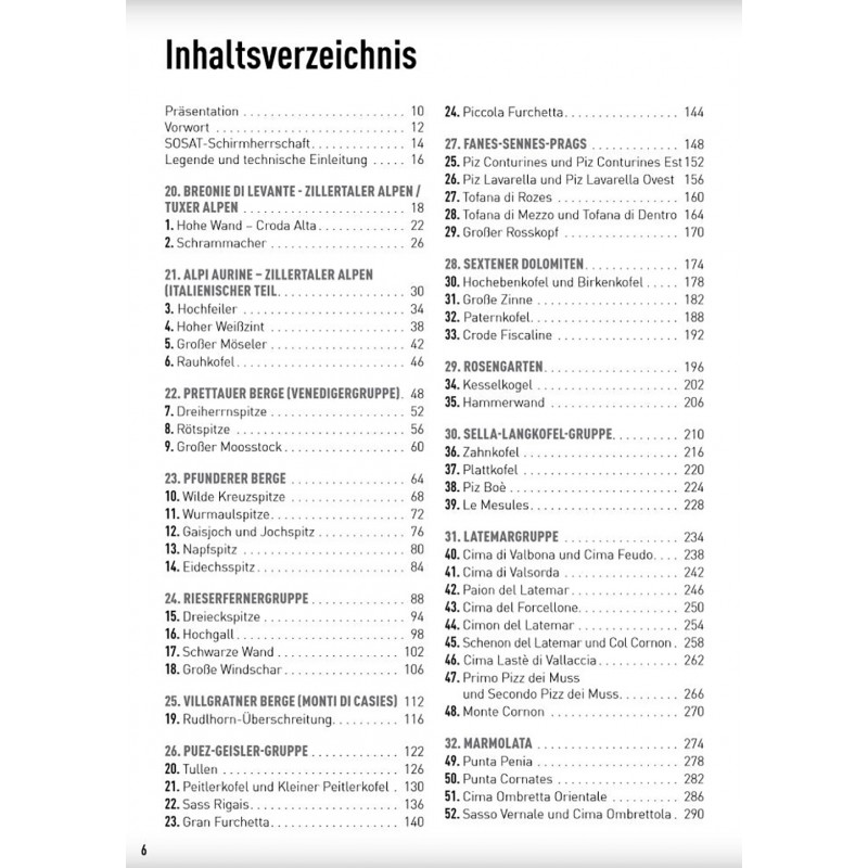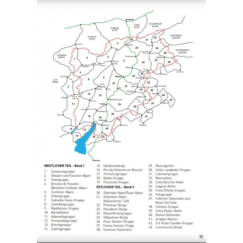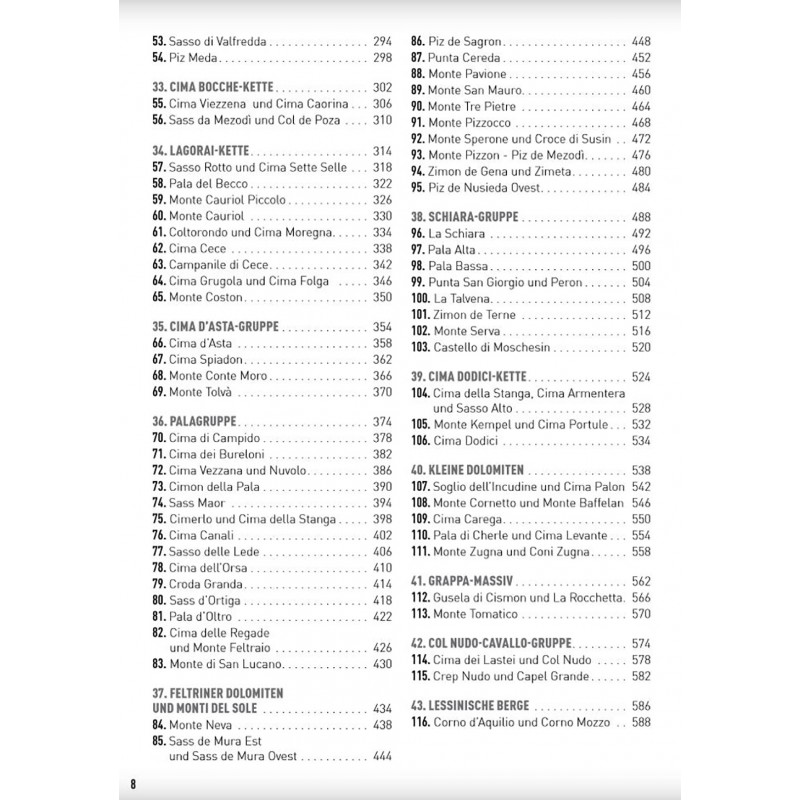 Folgende Gebiete sind im Führer enthalten: Breonie di Levante, Aurinische Alpen, Prettauer Berge, Pfunderer Berge, Rieserfernergruppe, Gsieser Berge, Puez-Geisler-Gruppe, Fanes-Senes-Prags-Gruppe, Sextener Dolomiten, Rosengarten, Sellastock/Langkofel, Latemar-Gruppe, Marmolada, Cima-Bocche-Kette, Lagorai-Kette, Cima-d’Asta-Gruppe, Palagruppe, Feltriner Dolomiten, Schiara-Gruppe, Zwölferkofel-Kette, Kleine Dolomiten, Grappastock, Col-Nudo-Cavallo-Gruppe, Lessinische Berge.