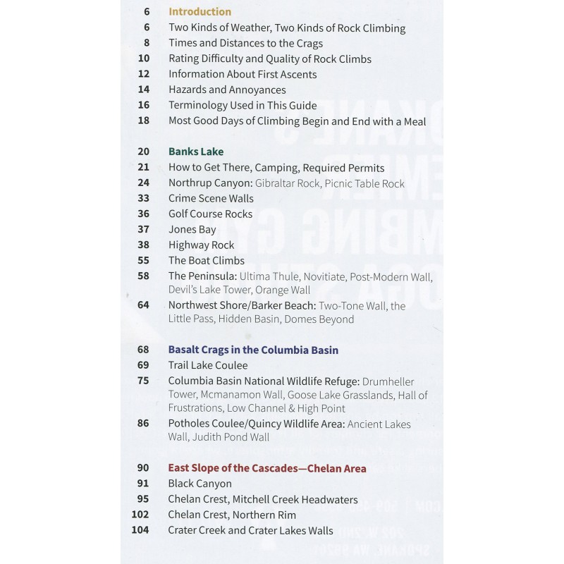 Climbing in Washington's Rainshadow behandelt eingeteilt in drei Hauptgebiete, verschiedene Klettermöglichkeiten im Basalt (mit dabei auch beeindrduckende eckige Basaltsäulen) und Granit des Banks Lake Gebietes, Columbia Basin und East Slope der Cascades. Dieses über 100-seitige Buch ist gespickt mit Sportklettereien in bemerkenswerten Gebieten und verspricht ausgezeichnete Abenteuer. Besonders beachtenswert ist, dass die meisten Routen in moderaten Schwierigkeitsgraden sind und so die Genusskletterer voll auf ihre Kosten kommen.