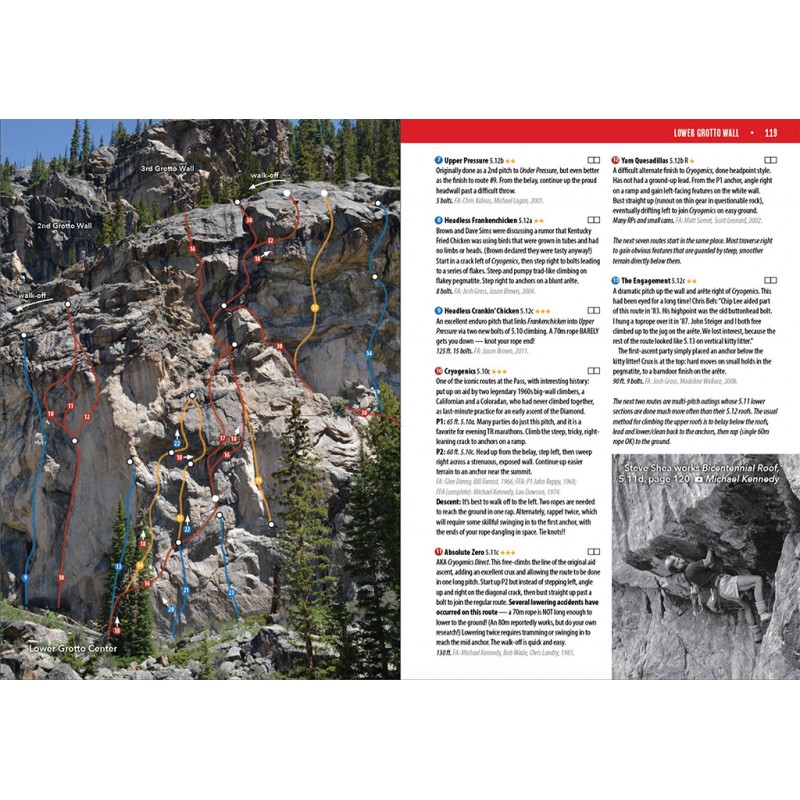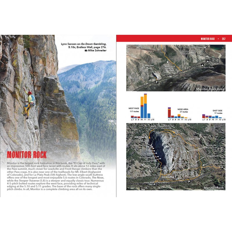 Zu den beliebtesten Gebieten gehören die „Grottos“, 10 Meilen östlich von Aspen, aber auch alle anderen Klettergebiete in der Umgebung sind gut dokumentiert und haben einiges zu bieten. Das neu eröffnete Gebiet „Gold Butte“, etwas außerhalb der Stadt bietet eine tolle Option für kaltes Wetter in einzigartigem Sandstein. Auf der anderen Seite des Passes werden die Klettermöglichkeiten am „Monitor Rock“ und am „Twin Lake“ vorgestellt. Es gibt viele neue Routen, die noch nie veröffentlicht wurden, darunter auch neue Mehrseillängenrouten, die viel Lob erhalten haben.