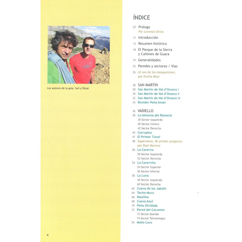 Mehrere Generationen von Kletterern haben hier verschiedene Routen erschlossen, die das Niveau und die Mentalität der jeweiligen Epoche widerspiegeln. Von den Pionierrouten der 1950er Jahre bis zu den extrem schwierigen Sportkletterrouten von heute ist hier alles zu finden. Es gibt auch andere Gebiete in der Nähe, die jedoch ihren eigenen Charakter haben, wie z.B: San Martín de la Val d'Onsera und Peña Predicadera. Neben einigen Mehrseillängenrouten werden auch einige Bouldergebiete vorgestellt. Der Schwerpunkt des Führers liegt jedoch auf Sportkletterrouten.