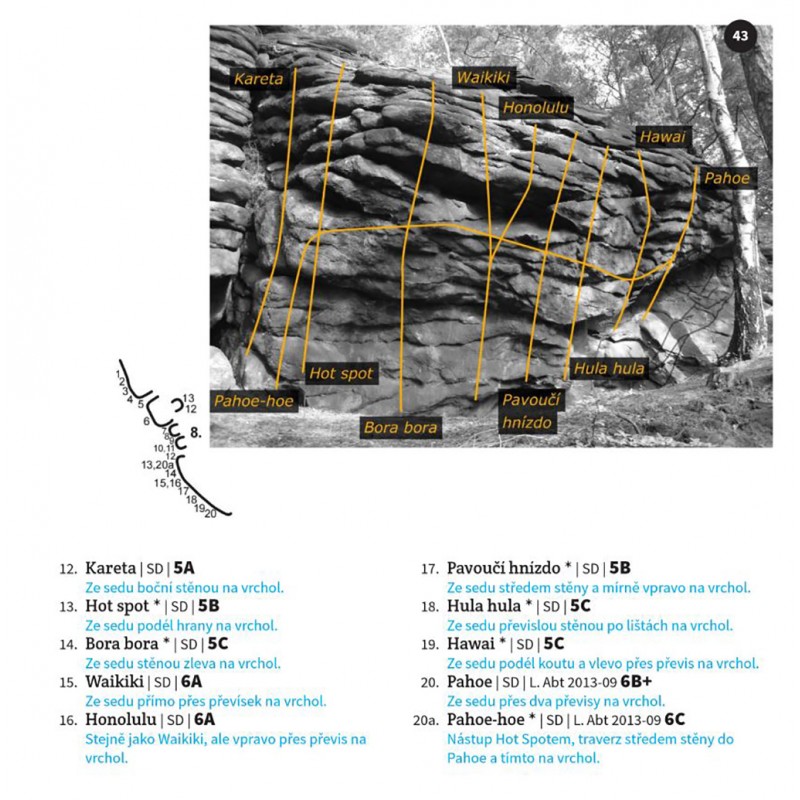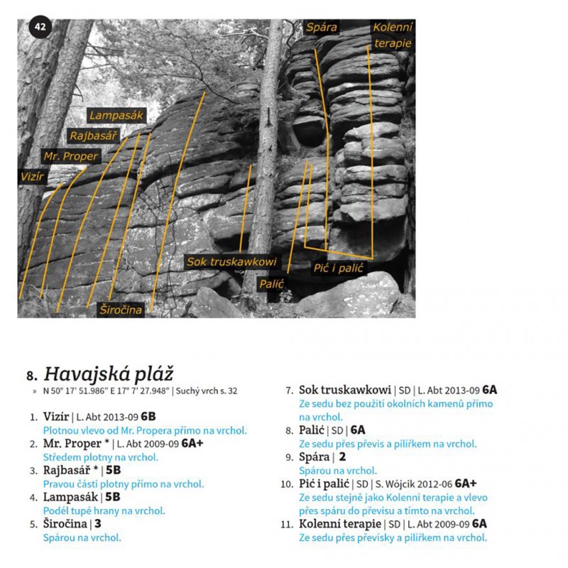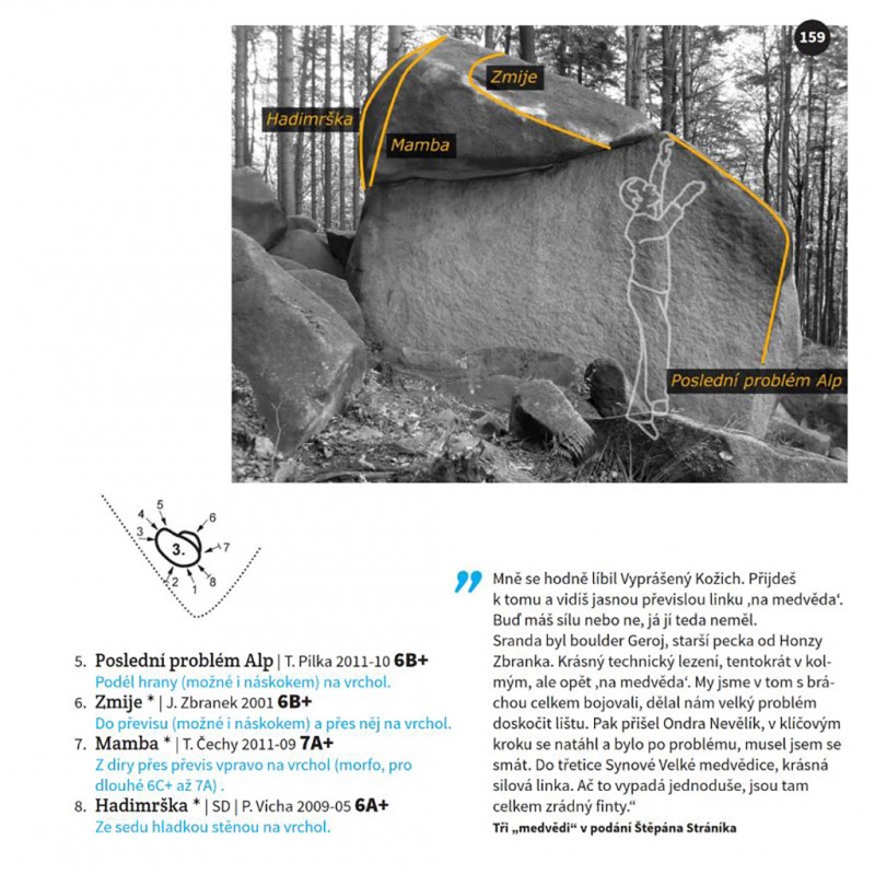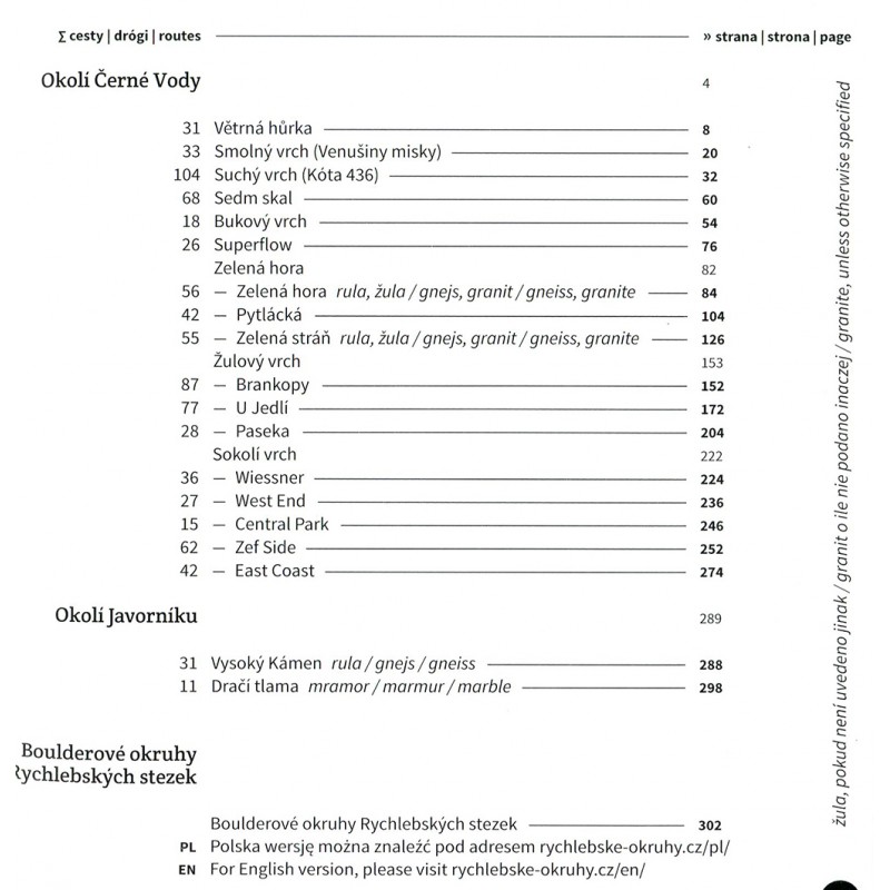 Fototopos, kleine Lagepläne, Beschreibungen, GPS-Koordinaten und ein kreativer Größenvergleich zur besseren Abschätzung der Boulderhöhe, machen diesen quadratischen Führer zu einen nützlichen Begleiter bei der Erkundung der Felsen von Rychlebské.