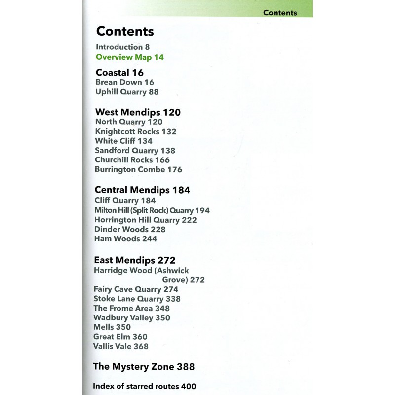 Südlich von Bristol liegen die Mendip Hills. Hier gibt es einige Felsen, teilweise in Steinbrüchen gelegen, an denen geklettert werden kann. Dieser Führer stellt auf 400 Seiten die Tradrouten vor. Auch wenn einfache Anstiege vorhanden sind, so sollte hier der Umgang mit mobilen Sicherungsgerätschaften sicher beherrscht werden. Mendip ist kein Plasirgebiet mit südfranzösischen Hakenabständen, sondern ist den Abenteuerkletterern vorbehalten und die Angaben der britischen E-Skala sollten bei der Routenauswahl berücksichtigt werden.