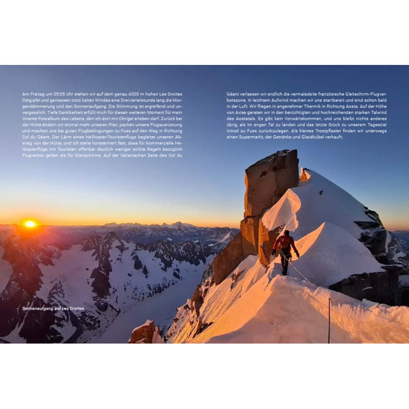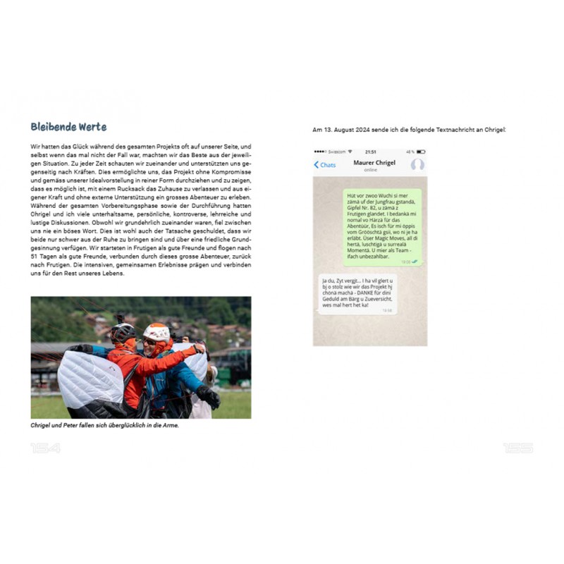 Am 10. Juni 2024 starten Chrigel Maurer und Peter von Känel von ihrem Wohnort Frutigen im Berner Oberland, um alle 82 Viertausender der Alpen zu besteigen – ausschliesslich zu Fuss und per Gleitschirm, ohne Supporter und möglichst am Stück. Der bergsteigende Gleitschirmprofi und der gleitschirmfliegende Bergprofi ergänzen sich perfekt und bilden für dieses Abenteuer das ideale Team. Nach 51 erlebnisreichen Tagen besteigen sie mit der Jungfrau ihren letzten Gipfel und fliegen von dort überglücklich zurück nach Frutigen – der Kreis schliesst sich. Die Symbiose zwischen Bergsteigen, hochalpinem Gleitschirmfliegen sowie Streckenflug ermöglicht verblüffende und ausgesprochen elegante Touren. Mit ihrem Stil beschreiten die beiden neue Wege auf alte Berge und werden immer wieder mit überraschenden Herausforderungen konfrontiert. Anschaulich, authentisch und mit einer Prise Ironie erläutert Peter von Känel die entscheidenden Erfolgsfaktoren bezüglich Vorbereitung, Taktik und Umgang mit Risiken und Fehlern. Packend schildert er die Stürme, die überwächteten Grate, das Fliegen am Limit und ihre Magic Moves, mit welchen sie als Team auf kreative Weise auch grösste Schwierigkeiten überwinden.