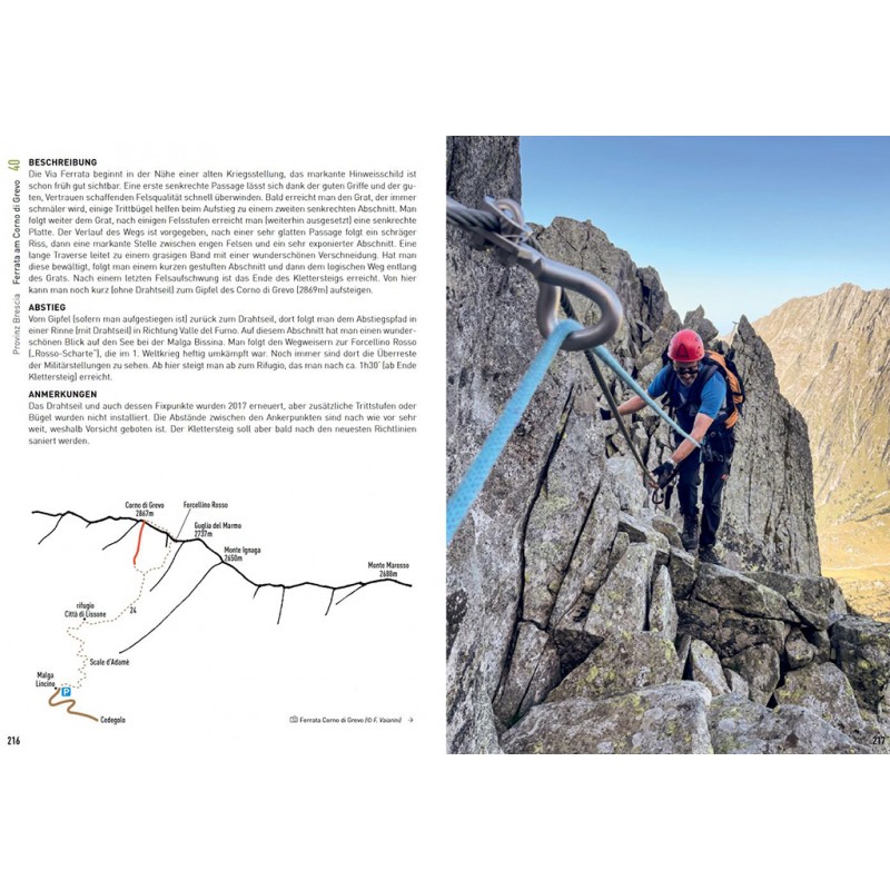 Als erfahrener Bergführer beschreibt Andrea "Bedoni" Carì die Eisenwege mit dem Ziel, allen Interessierten qualitativ hochwertige Informationen zu liefern und die Lombardei ist damit durchaus eine Alternative zu den meist recht überlaufenen Klettersteigen in Südtirol.