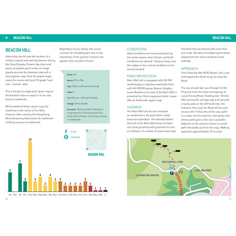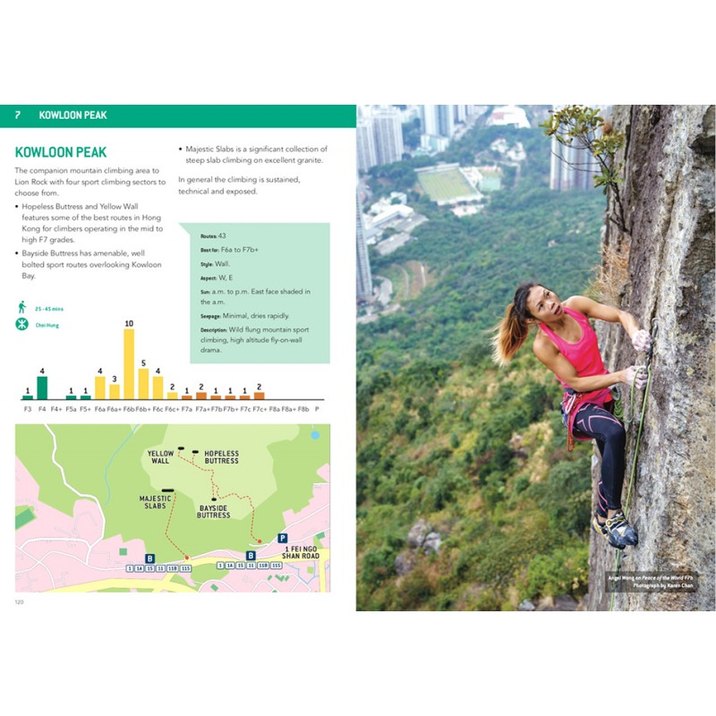 Vor Ort erwarten dich über 1700 Sportkletterrouten (mit 650 bisher unveröffentlichten Routen und 34 neuen Gebieten) verteilt auf zahlreiche Sektoren. Fotos vom Klettern rund um die Metropole sowie ein kurzer Abriss über die Geschichte der Kletterentwicklung in Hongkong runden das Führerwerk ab.
