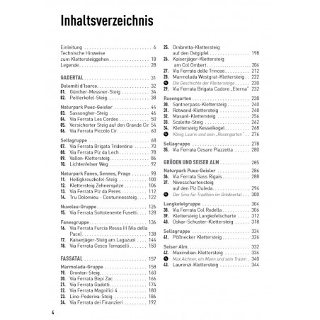 Dieser Klettersteigführer beschreibt die versicherten Steige und Klettersteige in den Dolomiten, die von den drei ladinischen Tälern Gadertal, Fassatal und Grödnertal eingerahmt werden. Insgesamt werden 43 Routen so detailliert wie möglich vorgestellt und beschrieben. Enthalten sind die Bewertung der technischen und geländebedingten Schwierigkeiten, die Gehzeiten für Zustieg und Klettersteig, die Gesamtdauer der Tour, die Höhenunterschiede, der körperliche Anspruch, die Ausgesetztheit und die Höhenlage.