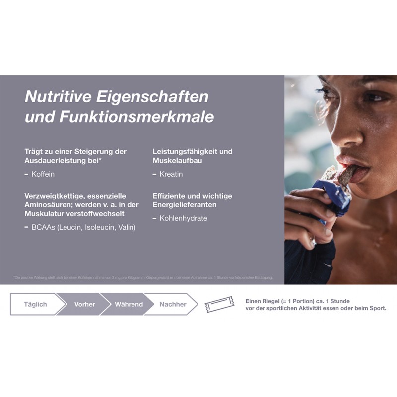 Funktionaler Sportriegel für den Nährstoff-Kick vor und während dem Sport. Mit BCAAs, Koffein und Kreatin.