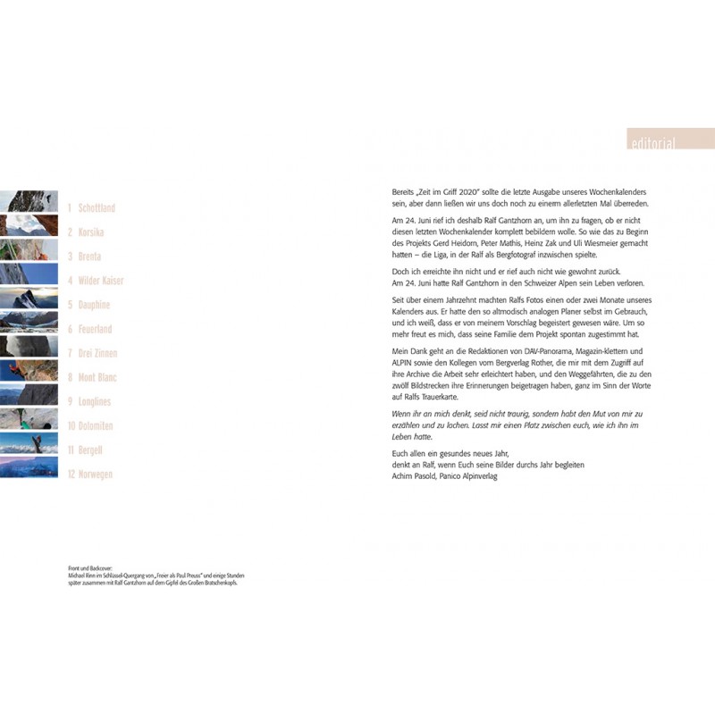 Der Wochenplaner "Zeit im Griff" bietet weit mehr als ein normaler Kalender, nämlich Impressionen und Infos zu Kletterrouten und Skitouren. Dicke 144 Seiten mit über 80 eindrucksvollen Actionfotos, durchwegs in Farbe, mit viel Platz für die täglichen Termine (linke Seite Foto - rechte Seite Wochenkalendarium), inklusive Jahresübersicht mit allen Ferienterminen und Mondphasen plus zwölf Doppelseiten Gebietsinfos mit Topos und Wandbildern. Ideal auch als Routenbuch, Tagebuch oder Familienkalender.