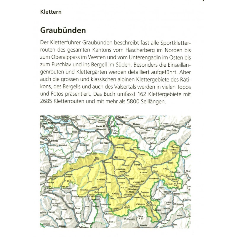 Der Kletterführer Graubünden beschreibt fast alle aktuellen Sportkletterrouten des gesamten Kantons vom Fläscherberg im Norden bis zum Oberalppass im Westen und vom Unterengadin im Osten bis zum Puschlav in Bergell im Süden. Besonders die Einseillängenrouten und Klettergärten werden detailliert aufgeführt. Aber auch die großen und klassischen alpinen Klettergebiete des Rätikons, des Bergells und auch des Valsertals werden in vielen Topos und Fotos präsentiert. Das Buch umfasst 162 Klettergebiete mit 2685 Kletterrouten und mehr als 5800 Seillängen. Das Engadin und das Bergell sind einfach schön und lohnen immer für eine Reise, aber auch in den anderen Gebieten ist man immer wieder erstaunt wie vielfältig das Kletterangebot ist.