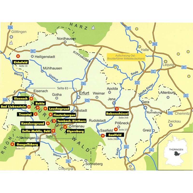 In Thüringen ist eine unglaubliche Vielfalt an Gesteinsarten zu finden. So wird an den Höhen des Thüringer Waldes an Granit und Porphyr geklettert, in den Tälern ist ein unglaublich steiles Konglomerat zu finden. Doch auch erstklassiger Lochkalk bietet sich zum Bouldern, sowohl im Westen des Freistaats (Bad Liebenstein), als auch im Osten um Saalfeld und Pößneck, an. Der Norden verfügt über Sandstein, an dem man sich ausgiebig die Finger lang ziehen kann. Das Eichsfeld wird sogar erstmalig in einem Führer vorgestellt. Alles in einem macht der gut gemachte Führer durchaus Lust, sich einmal unbekanntere Gefielde aufzumachen, um dort die besten Boulderspots auszuchecken. Sollte das Wetter doch mal schlecht sein, beschreibt ein zusätzliches Indoorkapitel alle Boulder- und Kletterhallen Thüringens.