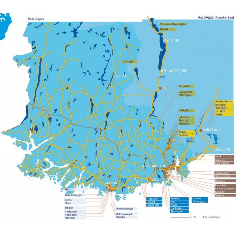 Noch südlicher geht es in Norwegen nicht! Schon bei der Einfahrt mit der Fähre in Kristiansand kann man vom Boot aus die ersten Klettersektoren (und auch das neue Kletterzentrum Sorlandet) erkennen. Hinzu kommt, dass diese Gegend die meisten Sonnenstunden in Norwegen hat. Ein idealer Start für jede Norwegenreise! Der Führer stellt 43 Sektoren vor, die sich wie folgt verteilen: 27 befinden sich rund um Kristiansand, 11 sind bei Mandal gelegen und 5 bei Birkeland. Den nördlichsten Punkt stellt als Bonusgebiet Urdviki, eine der wenigen Sportklettersektoren im Setesdal dar. Damit deckt der Führer eine Region ab, über die es bisher nahezu unmöglich war, gute Informationen zu bekommen. Bei den Routen handelt es sich überwiegend um gebohrte Sportkletterrouten. Wobei auch selbst abzusichernde Routen (nicht vom Setes- oder Nissedal) dabei sind. Um welche Art es sich handelt, ist deutlich gekennzeichnet. Boulder werden auch einige vorgestellt incl. mehreren Quergängen direkt über dem Wasser. Eine Sternchenbewertung hilft, die schönsten Routen zu finden und Piktogramme geben Auskunft über den Charakter.