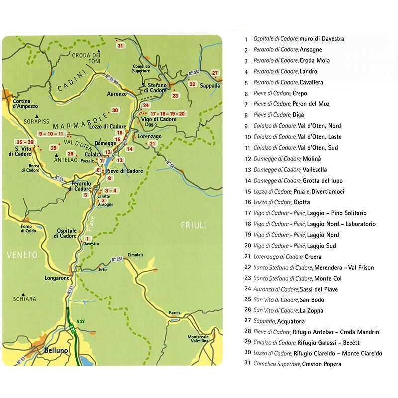 Klettern in Cadore? Viele werden die Region Cadore geographisch nicht einordnen können, bzw. haben von Cadore noch nie etwas gehört. Cadore liegt nördlich von Belluno und ist eine von den Dolomiten umrahmte Tallandschaft im norditalienischen Venetien. Und genau in dieser Region gibt es etliche Klettergärten, von denen 31 Stück in diesem Buch beschrieben sind. Verschiedene Symbole schaffen Klarheit der wesentlichen Fakten, Zugangsskizzen erleichtern das Auffinden und eine Sternchenbewertung weist einen auf die lohnenden Routen hin. Mit aufgenommen wurde auch das Bouldergebiet "Sassi del Piave" mit über 80 definierten Problemen (von 5b bis 7c) sowie zwei künstliche Kletterwände (darunter eine Staudammmauer mit vielen Kinderrouten und einem Klettersteig).