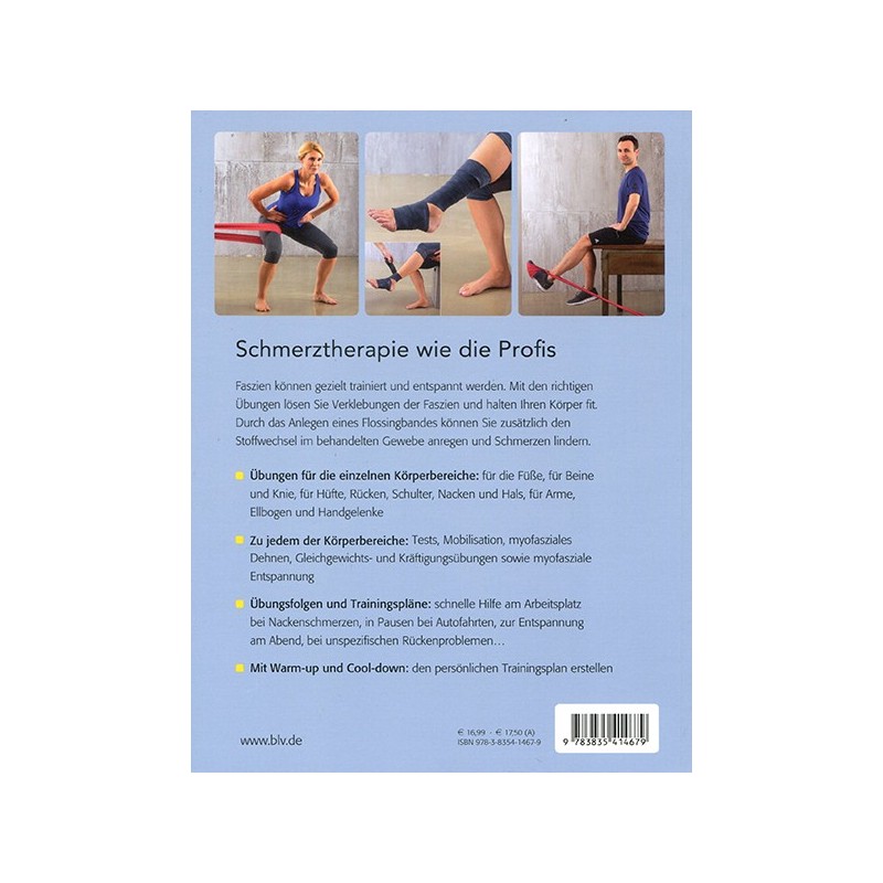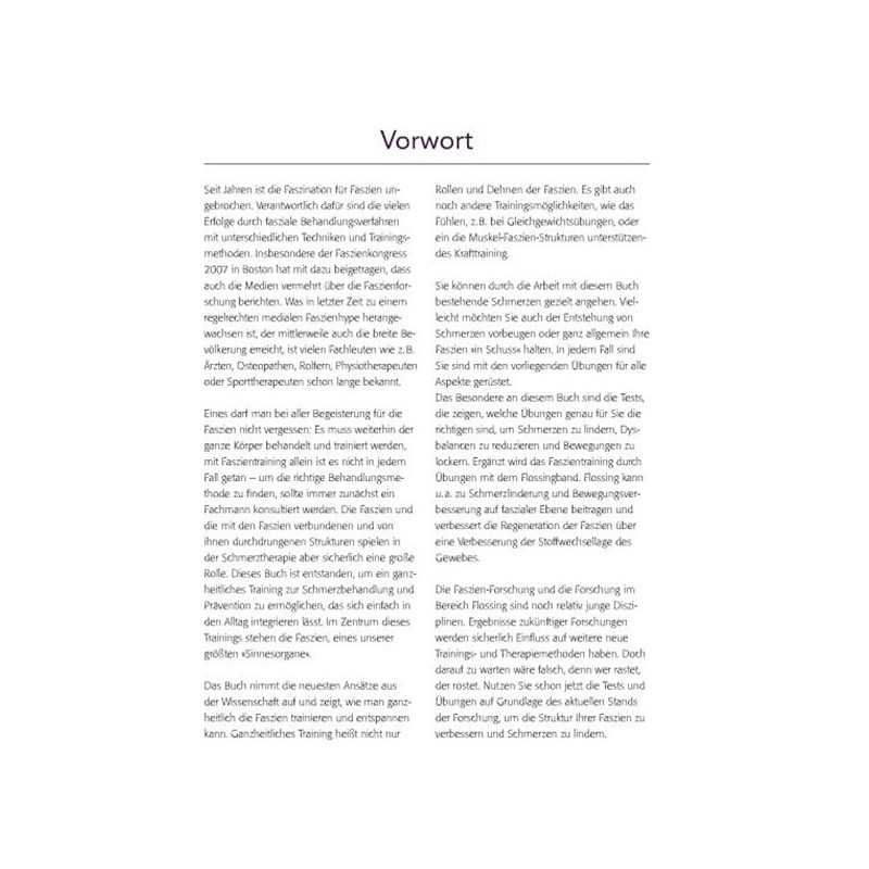 Das erste Buch, das die Themen Faszien, Schmerztherapie und Flossing (Training bei dem eine Extremität mit einem Latexband verbunden und bewegt wird) verknüpft. Faszien können und sollen gezielt trainiert werden. Mit den richtigen Übungen können Verklebungen gelöst werden und der Körper insgesamt auf ein höheres Leistungsniveau gebracht werden. Dieses Buch stellt zahlreiche Übungsvorschläge zu einzelnen Körperbereichen vor, bietet Test, Mobilisation-, Gleichgewichts- und Kräftigungsübungen an. Diese können in Übungsfolgen für die kleine Mobilisation zwischendurch oder mit Warm-up und Cool-down als richtiges Trainingsprogramm zusammengestellt werden. Ein Buch für die Praxis, ohne das Hintergrundwissen zu vernachlässigen.
