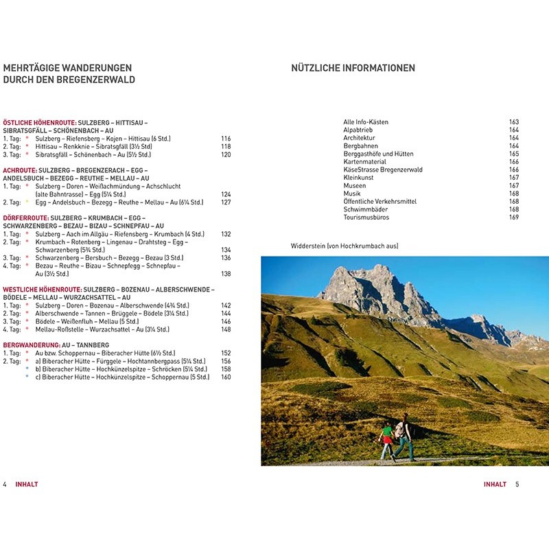 Dieser Wanderführer stellt 33 Themenwanderungen vor, wobei es sich dabei fast durchgehend um Rundwege handelt: Kulturwege, historische Wege, Sagenwege, Alpwege, Naturlehrpfade, Familienwege, Wasserwege und Gipfelwege. Zusätzlich werden fünf Weitwanderrouten von zwei bis vier Tagen beschrieben, die auch in einzelnen Tagesetappen begangen werden können: zwei Höhenwege, ein Dörferweg, ein Bergweg und eine Route entlang der Bregenzerach.