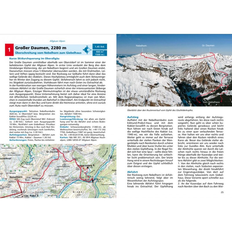 Jede Skitour ist mit einer zuverlässigen Routenbeschreibung, einer Tourenkarte und einem aussagekräftigen Foto mit eingezeichneter Route versehen. Wichtige Angaben zu Lawinengefährdung und Exposition machen die Planung noch sicherer. Geprüfte GPS-Tracks stehen zum Download bereit und erleichtern die Orientierung vor Ort. Für umweltbewusste Wintersportler gibt es außerdem praktische Hinweise zu Bus- und Bahnverbindungen.