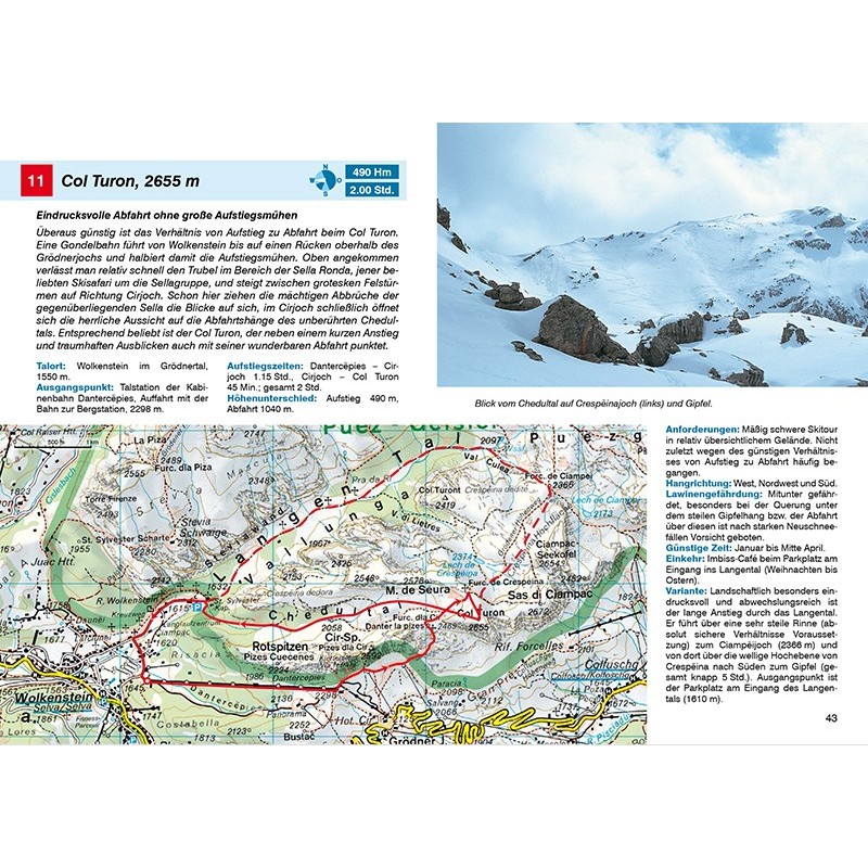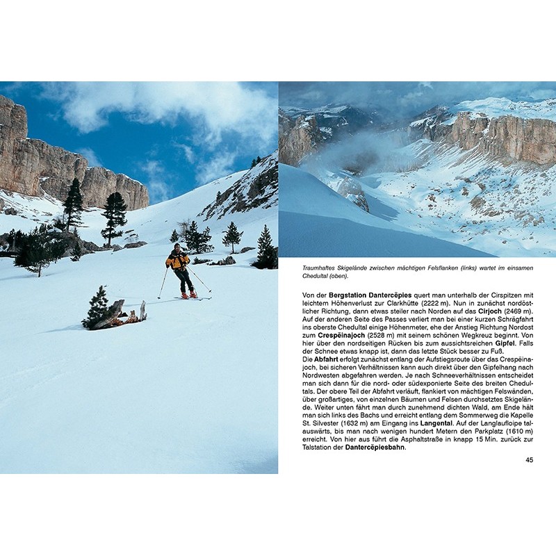 Traumhafte Abfahrten und traumhafte Ausblicke – die Dolomiten sind ein perfektes Gebiet für Skitouren. Auf den ersten Blick mögen die Gipfel zwar sehr steil und felsig wirken, doch tatsächlich eröffnen sich Skitourengehern viele attraktive Ziele. Sonnige Hochflächen mit Felskulisse, aussichtsreiche Grate, schmale Rinnen und schließlich eine lange Abfahrt. Dieser Skitourenführer stellt 55 abwechslungsreiche Touren vor. Die Skitouren führen in die Sennes- und Fanesgruppe, die Lagoraigruppe, in die Marmolada sowie in die Felsmassive der Geislergruppe, des Monte Cristallo, der Palagruppe und den Sextener Dolomiten vor. Genaue Anstiegsbeschreibungen, Tourenkärtchen mit eingetragenem Routenverlauf sowie Tourensteckbriefe mit Hinweisen zu Talorten und Ausgangspunkten, Höhenunterschieden und Aufstiegszeiten, Anforderungen, Lawinengefährdung und Hangausrichtung, günstiger Jahreszeit und Varianten erleichtern die Auswahl und Planung der Touren sowie die Orientierung am Berg.