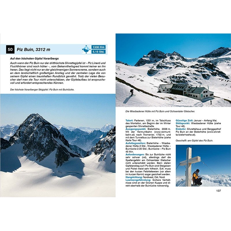 Das Skitourengebiet Vorarlberg ist nicht nur schneesicher, sondern auch sehr vielfältig. Es bietet Tourenmöglichkeiten für jeden Geschmack und jedes Können! Dieser Skitourenführer stellt die 50 schönsten Toure vor – von der gemütlichen Vorgebirgstour bis zur anspruchsvollen Gletschertour. Das Winterparadies im Bregenzerwald, Rätikon, Montafon und in der Silvretta ist unter Tourengehern zwar kein Geheimtipp mehr, doch überlaufen sind die vorgestellten Gipfel keineswegs. In der Auswahl finden sich beliebte Klassiker ebenso wie stille, wenig bekannte Ziele – oftmals ist man selbst bei besten Verhältnissen alleine unterwegs. Einsteiger wie Könner finden Tourenvorschläge für die ganze Saison: von Touren nach den ersten größeren Schneefällen im Frühwinter bis zu genussreichen Gipfeln im Hochwinter. Im Frühjahr geht es schließlich auf die Dreitausender der Silvretta – auf deren spektakulären Gipfeln lässt sich die Skisaison bis Ende Mai ausdehnen. Alle Tourenvorschläge verfügen über präzise Routenbeschreibungen, dazu kleine Kartenausschnitte mit eingezeichnetem Streckenverlauf sowie Expositionssymbole, welche die Hangausrichtung grafisch darstellen. Ein Tourensteckbrief informiert über Anforderungen, Höhenunterschiede, günstigste Jahreszeit, Lawinengefährdung und vieles mehr. Für viele Routen werden auch Varianten für noch mehr Möglichkeiten aufgezeigt. Zahlreiche Fotos wecken die Vorfreude auf die winterlichen Unternehmungen.